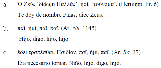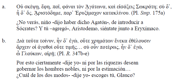 (8)Ahora bien, el que φημί sea libre, en el sentido indicado, no lo libra de ciertos encasillamientos. La construcción normal es la del verbo solo o con sujeto pospuesto. Sin embargo, en algún pasaje, como en el de (9a), el sujeto precede al verbo,8 y en otros se intercala entre ambos algún segmento, como ocurre con el vocativo de (9b).