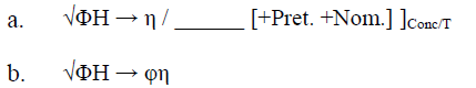(19)De acuerdo con (19), φη se convierte en el morfo no marcado de la raíz √ΦΗ, que se insertará siempre que no pueda insertarse η, por el principio que ordena la aplicación de las reglas según el grado de especificidad (Halle y Marantz 1996:120; Bobaljik 2012:9). Pero el contexto de (19a) implica que tal opción ocurre solo cuando la adherencia del pronombre aporta el rasgo de caso. En los otros contextos, menos específicos, aparecerá el exponente no marcado.