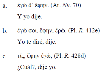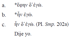 (6)Respecto de ἠμί, cabe indicar que las formas del pretérito son su manifestación más genuina, y las únicas que aparecen en los textos platónicos. No obstante, el pretérito de ἠμί no se da con sujeto elíptico o expresado mediante frase nominal plena. Tampoco, con sujeto antepuesto. El verbo se construye siempre con sujeto pronominal pospuesto precedido de la partícula δέ apostrofada (δ᾿). Es lo que se ve en los ejemplos de (7).