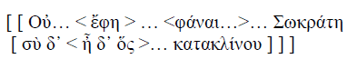 (2)El texto de (2a) presenta tres unidades demarcativas: ἔφη, φάναι y ἦ, en el orden dado. Con el trasfondo del argumento de El Banquete como marco de interpretación, se constata que estas remiten a tres niveles de discurso y dos tipos de cambio de fase. La primera unidad (ἔφη) conduce al nivel superior, en el que un colocutor hace la mímesis de la mímesis de otro: Apolodoro imita (nivel superior) a través de la imitación oída de Aristodemo (nivel intermedio) el habla de Agatón (nivel primario). La segunda unidad demarcativa (φάναι) remite sin más al nivel intermedio, ofreciendo la mímesis de Agatón por Aristodemo, que se segrega del habla atribuida al emisor precedente (el propio Aristodemo), en un caso prototípico de transición de voces en el diálogo. La última unidad (ἦ ) se mueve también en este nivel intermedio, pero apunta de manera más específica al discurso primario (palabra de Agatón), en el interior del cual separa el segmento dirigido a un interlocutor distinto (Aristodemo) de aquel al que se destina el resto del enunciado (παῖ), claro ejemplo de cambio de fase por variación del destinatario. Se comprueba, así, la interacción de ἠμί y φημί dentro del mismo turno de palabra. La estructura de la delimitación proyectada por la información que aportan los elementos demarcadores, es la de (3), donde los paréntesis angulares encierran los verbos demarcadores, mientras que los corchetes señalan el abarque de cada segmento delimitado. El demarcador de mayor abarque (en este caso, ἔφη) aparece regularmente delante de los que poseen abarque menor.
