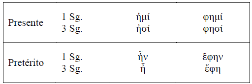 En ático clásico, las formas del verbo defectivo ἠμί ‘yo digo’ guardan con respecto a las de φημί ‘yo digo’ una relación que va más allá de la mera sinonimia. En primer lugar, como se desprende del contenido del Cuadro 1, muestran, en los casos en que es posible establecer con certidumbre el examen comparativo, especificaciones morfológicas virtualmente idénticas.