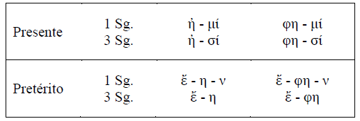 Así, partiendo del supuesto de que las raíces son η- y φη- (Monro 1891:11s.; Fernández Galiano 1971:148; Chantraine 1974:413), la correspondencia morfológica queda claramente establecida al emparejar las expresiones que se hallan en el paso previo a la aplicación de la regla que contrae el aumento temporal en el pretérito,1 como se ve en el Cuadro 2.