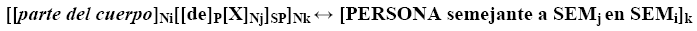 en los que el primer constituyente es un lexema que pertenece al grupo de N subespecificado como ‘partes del cuerpo’ y que desde el punto de vista semántico se restringe al significado de ‘persona’. Es decir, en términos de la Gramática de la Construcción, estamos ante CONSTRUCCIONES IDIOMÁTICAS (constructional idioms), con un primer constituyente semánticamente subespecificado (una casilla, slot), que liga un significado específico (‘persona’) cuando aparece en estas construcciones, que los hablantes usan de forma productiva.