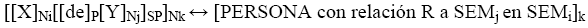 A partir de este esquema unificado, que relaciona la estructura formal con una estructura semántica, el hablante puede almacenar bloques seriales de pares forma-significado con propiedades paradigmáticas y sintagmáticas regulares y sistemáticas. El esquema nos permite explicar cómo las variables X son paradigmas tanto formales, ya descritos, como semánticos. Por ejemplo, X puede asumir el significado de CABEZA o de otras partes del cuerpo (somáticas). La información para la variable Y está más relacionada con aspectos culturales e idiosincrásicos y su significado puede remitir tanto a OBJETOS como a ANIMALES.