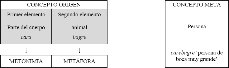 Con el fin de especificar la naturaleza de las relaciones semánticas que tienen lugar en estas estructuras (R en el esquema formal expuesto arriba), acudiremos a la sistematización de los procesos metafóricos y metonímicos tal como se propone en la perspectiva cognitivista, ya que el análisis de la metáfora y la metonimia en relación con la creación léxica ocupa un lugar central en esta teoría,5 proporciona herramientas de análisis útiles para un acercamiento al estudio de las construcciones que nos ocupan y constituye uno de los criterios principales que permiten proponer procesos de lexicalización semántica.