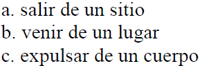 En este caso, el abandono del espacio se define por el tramo final del movimiento: no importa el inicio del desplazamiento –de dónde venga– mientras que esté en el interior del espacio acotado, y basta con que ese desplazamiento atraviese el perímetro del objeto para que se satisfaga la relación espacial que expresa esta preposición. En el dominio de los eventos, esto se refleja directamente: no importa cuánto tiempo se haya dado la situación concreta, o hasta qué punto se ha desarrollado, siempre y cuando se abandone.
