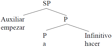 El auxiliar, en nuestra estructura, no encabeza una capa más de la estructura, sino que opera directamente sobre el núcleo preposicional con su valor aspectual. Esto da cuenta del hecho de que en primer lugar el auxiliar tenga obligatoriamente que operar sobre la noción abstracta introducida por la preposición, y en segundo lugar de que tenga la capacidad de identificar esa noción abstracta de acuerdo a su interpretación específica. Recordemos que con el punto expresado por la a un verbo que indica el inicio de un evento fuerza la lectura de que ese punto es el inicial dentro del evento, mientras que un verbo que denota cercanía a un modelo (como venir) da una idea de que el punto está en la periferia de lo denotado por el infinitivo.