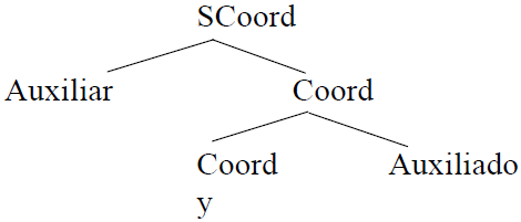 En nuestra estructura el nexo y el infinitivo forman un constituyente sintáctico (núcleo-complemento) en exclusión del auxiliar, que es su especificador. Esperamos, si nuestra estructura es correcta, que el nexo y el infinitivo manifiestan un mayor nivel de integración que el auxiliar y el nexo, por tanto. Esto queda confirmado por varios diagnósticos básicos que ya se han mostrado (RAE & ASALE 2009: §28.5r): es posible intercalar el sujeto entre el auxiliar y el nexo, pero no entre el nexo y el auxiliado (53), y es posible coordinar dos auxiliares, pero no dos sumas de auxiliar y nexo (54).