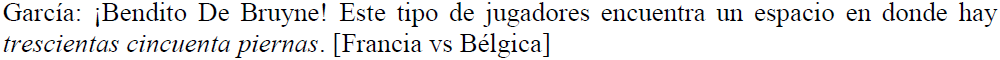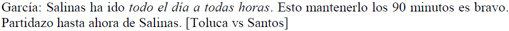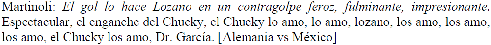 Para el presente estudio, hemos elegido trabajar únicamente con los materiales de esta televisora, porque, sin examinar rigurosamente, hemos escuchado numerosas figuras hiperbólicas producidas por estos periodistas en concreto3. Cabe advertir que para el presente corpus hemos considerado solo la narración que corresponde a los partidos como tales, esto es a partir de que el árbitro declara el inicio del encuentro hasta que lo da por terminado. En otras palabras, no hemos tomado en cuenta los comentarios previos o posteriores a los juegos.