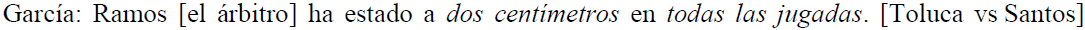 Como hemos comentado anteriormente, con base en Cano Mora (2009: 111), en el corpus también distinguimos hipérboles que refieren a la distancia que existe entre dos entidades. En los fragmentos (11) y (12), advertimos un par de ejemplos donde se exagera la cercanía a la que se encuentra el árbitro respecto de las jugadas del partido (11), así como el espacio que le conceden a un futbolista los jugadores rivales (12).