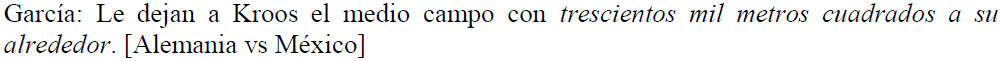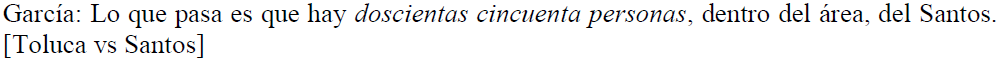 Las cantidades que hemos registrado en nuestros materiales también fungen como determinantes, como se aprecia en los fragmentos de (7, 8, 9, 10). En estos ejemplos, cuando solamente existen veintidós futbolistas en el campo, se extrema la cantidad de personas en el área grande (7), de futbolistas en el medio campo (8) o de piernas en un espacio específico del terreno de juego (9).