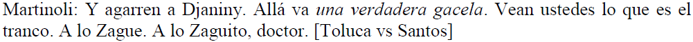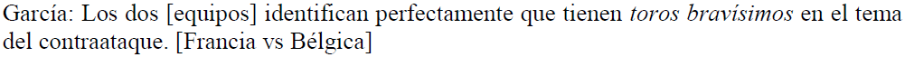 En el fragmento textual de (13), futbolistas de los equipos de Francia y Bélgica son equiparados con toros bravos por su fuerza. Igualmente, en (14), los futbolistas que se encuentran jugando por el equipo alemán son comparados, de nueva cuenta, con un toro. En (15), se asemeja a un futbolista con una gacela por su rapidez. Los sustantivos que refieren a animales se hacen acompañar ya sea de adjetivos con funciones atributivas, como en (13) y (15), ya sea de sintagmas preposicionales que refuerzan la magnitud o proporción, como en (14).