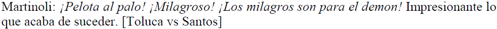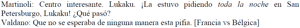 Finalmente, hemos identificado hipérboles que son empleadas en repetidas ocasiones, como sucede en (26) y (27). Reconocemos que, mediante el presente corpus de dimensiones tan modestas, no podemos asegurar la lexicalización de las hipérboles. Sin embargo, podemos dar indicios para futuras investigaciones y, a la vez, nos atrevemos a sugerir que existen hipérboles que podrían considerarse lexicalizadas en el marco del discurso deportivo, sobre todo porque hemos escuchado estas hipérboles de manera iterativa en otras narraciones futbolísticas, pero no sistematizadamente.