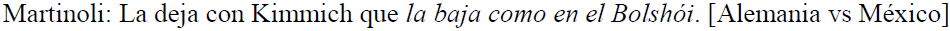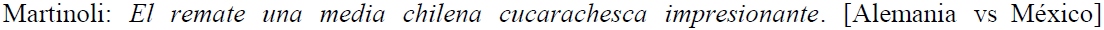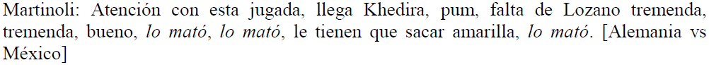 Por último, respecto de las acciones desarrolladas en la cancha que no son propiamente jugadas, estas se producen esencialmente a través de enunciados en los que el verbo juega un rol importante, como en (24, 25, 26, 27, 28, 29). En el fragmento (24), advertimos el verbo matar, antecedido del pronombre personal de complemento directo lo en tres ocasiones para referir a la consecuencia perjudicial de una falta cometida por un futbolista mexicano sobre un jugador alemán.