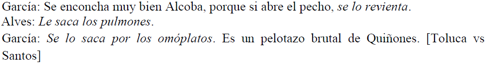 En el ejemplo (25), observamos una conversación entre los analistas García y Alves, en la que comentan un pelotazo recibido por un futbolista del equipo Santos. A fin de intensificar la consecuencia de dicho golpe, el primer analista utiliza el verbo reventar antecedido de los pronombres de complemento indirecto sey de complemento directo lo para hacer referencia al futbolista Gerardo Alcoba y al pecho de este respectivamente. El segundo analista da seguimiento a la ponderación, recurriendo al verbo sacar antecedido del pronombre de complemento indirecto le y seguido del sintagma nominal los pulmones en función de complemento directo. Finalmente, el primer analista vuelve a intervenir, repitiendo el verbo sacar, esta vez precedido de los pronombres de complemento indirecto se y de complemento directo lo y seguido del sintagma preposicional por los omóplatos para culminar el comentario de la terrible supuesta consecuencia del pelotazo, de no haberse enconchado el jugador Alcoba.