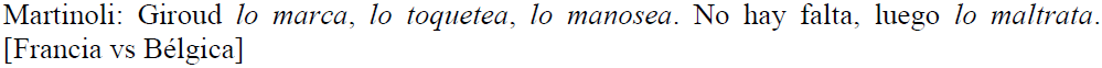 Asimismo, en el fragmento (10), el especialista deportivo utiliza tanto el sintagma nominal todo mundo como el pronombre indefinido nadie para dramatizar la cantidad de jugadores que, por un lado, busca el balón y la cantidad que logra hacer algo, por otro lado. En este enunciado coordinado por el nexo de concesión pero, advertimos un claro ejemplo de aúxesis en la primera cláusula y otro ejemplo de meiosis en la segunda cláusula. Igualmente, cabe destacar la repetición del verbo llegar en copretérito negativo con tres diferentes sujetos: Pogba, Pavard y Giroud, construcción que refuerza la hipérbole de meiosis.