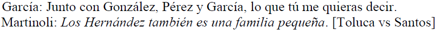 En cuanto a las ironías, observamos que (38-39) expresan lo contrario de lo que realmente quieren decir. Con ello, los narradores del encuentro no solamente dan lugar a una ironía, sino también a una hipérbole. En (38), uno de los analistas señala que ciertos apellidos son sumamente recurrentes, el periodista principal añade a la lista otro apellido y advierte que las personas que llevan dicho apellido constituyen una familia pequeña a fin de señalar justamente lo contrario.