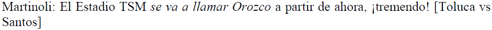 En el fragmento de (41), el periodista pondera una atajada del portero del equipo Santos diciendo que el estadio de su club tendrá un nuevo nombre y que este será justamente el apellido del portero, todo esto como consecuencia de dicha atajada.