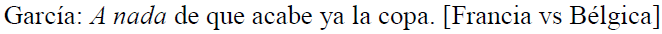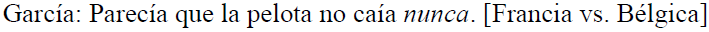 Asimismo, tal como sucede en Cano Mora (2009), identificamos enunciados en los que se recurre al pronombre indefinido nada, así como al adverbio nunca para exagerar la duración de un suceso, como se observa en (3) y (4). En el fragmento (3), se extrema el tiempo faltante para que culmine el evento de la Copa del Mundo. En (4), se dramatiza el tiempo que tarda en caer el balón a tierra.
