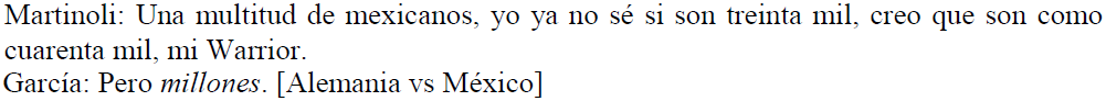 Respecto de la cantidad, hemos de considerar lo que Cano Mora (2009: 108) señala respecto del papel que juegan las cantidades y los números en la creación de hipérboles. En (5-6), advertimos la presencia de las cantidades millones . mil a manera de sustantivos. En el ejemplo (5), el periodista principal habla de miles de mexicanos que se encuentran en el estadio; mientras que el periodista especialista presenta una réplica dramatizando la cantidad a millones. En la ilustración de (6), el periodista principal extrema la cantidad de futbolistas que marcan al jugador Mbappé y, para ello, señala que este último se encuentra entre mil. Después de la cantidad aludida, el periodista utiliza en tres ocasiones la construcción Mbappé + verbo, dos veces con seguir y una con intentar, a fin de acentuar la dificultad que enfrenta el futbolista francés.7