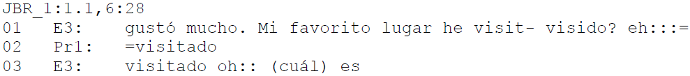 Los problemas, en este tipo de HR, son de carácter formal exclusivamente. Este es el caso que se observa en (1). En este extracto, la alumna muestra en su turno de habla que no conoce el participio del verbo ‘visitar’, por lo que, tras una autorreparación autoiniciada, muestra de la duda que le acaece la forma verbal, expresa en formato de pregunta la forma verbal para que el profesor le indique si es correcta o no.