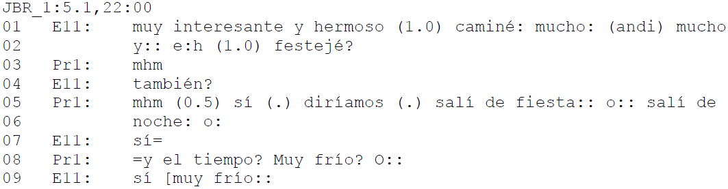 Las interacciones analizadas en este estudio son interacciones centradas en el significado (Seedhouse, 2004) que siguen el modelo denominado Round Robin (Mortensen y Hazel, 2011). En estas, el profesor va preguntando a los alumnos, al inicio de la clase, qué hicieron durante el fin de semana anterior o qué van a hacer durante el fin de semana siguiente, dependiendo del día en el que se lleva a cabo la clase. Cabe tener en cuenta que, al ser un curso extensivo, las clases se realizaban cada martes y cada jueves, por lo que los martes se preguntaba por el fin de semana anterior y los jueves por lo que iban a hacer durante el siguiente. A este respecto, debemos tener en cuenta que los estudiantes norteamericanos que cursan un semestre en Barcelona suelen aprovechar los fines de semana para viajar por Europa y visitar otras ciudades del continente. El profesor, consciente de ello, incide en el tema de los viajes para que puedan hablar sobre un tema específico de su experiencia durante el semestre dado el nivel de dominio de español que tenían.