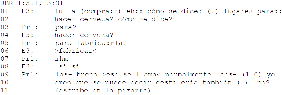 En esta HR autoiniciada, el alumno, al producir su turno de habla, solicita la ayuda de su interlocutor al percibir que no posee el conocimiento léxico adecuado para decir lo que quiere decir. Para ello, formula una determinada unidad léxica “hacer cerveza” (línea 2) en tono ascendente para indicar que no está seguro de que este contenido léxico sea el adecuado para con lo que quiere decir. Para reforzar la puntualización del problema el alumno utiliza un enunciado característico de este tipo de reparaciones, preguntando explícitamente por cómo se dice en español lo que él quiere decir y, a la par, indicar que considera inadecuado el vocablo que ha utilizado anteriormente. Sin embargo, en el turno de habla siguiente al del alumno, el profesor no formula un enunciado reparador, sino que inicia otra secuencia de reparación (línea 3) a partir de la formulación de un enunciado con la palabra anterior a la del elemento problemático en el turno de habla del alumno. Ante esta iniciación de reparación, el alumno responde repitiendo el elemento problemático (línea 4), pero en entonación ascendente, recordando que considera un problema esta expresión e incidiendo en la petición de ayuda al profesor. El profesor ofrece posteriormente el elemento con el que solucionar el problema, pero también muestra inseguridad a la hora de validar la reparación, al formular el enunciado en entonación ascendente y con un alargamiento vocálico. Se observa, pues, que la primera iniciación de reparación por parte del profesor no se formulaba por un problema en la audición sino para que el alumno corroborara que era ese elemento el que quería marcar como problemático. Finalmente, el alumno corrobora que la opción que aporta el profesor es adecuada al repetir sólo en infinitivo, sin el pronombre, la solución que le ha ofrecido el profesor (línea 6).