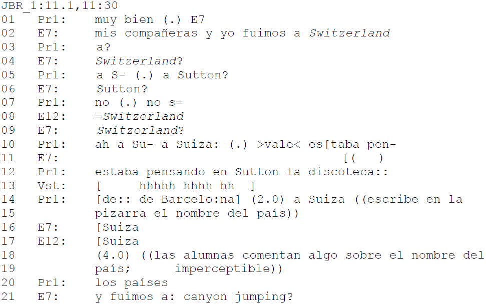 Como se puede comprobar en el extracto anterior, las secuencias de reparación pueden entrañar una enorme complejidad. Pueden implicar la participación de más de dos hablantes, a pesar de ser una interacción Round Robin. Puesto que el viaje a Suiza fue realizado por varias estudiantes, algunas de las que fueron se ven en la tesitura de participar para aclarar el vocablo problemático, que ha sido formulado en inglés. Es el caso de E12, que repite el elemento problemático ante la imposibilidad de ofrecer una reparación por parte del profesor. Además, la ruptura de la progresividad viene dada por el hecho de que el profesor no entienda una referencia utilizada por la alumna, quizás por haberla producido en una lengua que no es la de uso habitual en el aula. Sin embargo, el elemento reparador que aporta el profesor es inadecuado, aunque ya lo formula con entonación ascendente, iniciando una solicitud de corroboración, mostrando inseguridad ante el término. El turno de habla, proyectado por la solicitud de corroboración, muestra como el intento de reparación es inadecuado, puesto que la alumna marca que no acaba de comprender por qué se acaba de decir lo que se acaba de decir. La reacción del profesor es la de atestiguar que su intento de reparación era inadecuado, a partir del uso del adverbio de negación ‘no’ (línea 07), ante lo cual una alumna que no estaba participando en la interacción decide repetir el elemento reparable para ver si, en una segunda oportunidad, el profesor es capaz de lograr formular un elemento reparador adecuado. Le acompaña la alumna con quien el profesor estaba hablando, aunque ella vuelve a marcar el elemento reparable en entonación ascendente (línea 08). Finalmente, el profesor logra traducir el nombre del país en cuestión y aportar la solución al problema. Sin embargo, dado que anteriormente había propuesto otro elemento reparador, tras la solución válida tiene que justificar por qué antes había propuesto otro vocablo (línea 12).