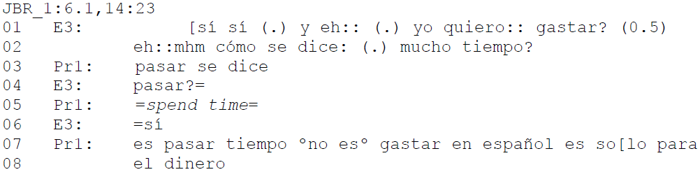 En el ejemplo anterior, el alumno duda sobre la adecuación de una determinada forma verbal para expresar una determinada idea, ‘pasar mucho tiempo’ (línea 2), concretamente, en un determinado lugar (datos no mostrados). Ante la dificultad de no saber exactamente cómo se expresa esa idea en español, el alumno produce un enunciado a partir de una palabra, ‘gastar’ (línea 1), que equivale al vocablo que se utiliza en inglés. Sin embargo, en este contexto, esta traducción es inadecuada, puesto que en español peninsular se utiliza otro vocablo, ‘pasar’, como así matiza el profesor (línea 3). Fijémonos en que el alumno no está seguro de su creación enunciativa, puesto que pide ayuda al profesor para que le corrobore su hipótesis. El enunciado contiene dos iniciaciones de la reparación. En primer lugar, el alumno marca el vocablo problemático en entonación ascendente y, tras una pausa de medio segundo, inserta un iniciador de reparación con el que explícitamente indica desconocimiento ante la producción del enunciado en cuestión y solicita ayuda al profesor (línea 1). Este iniciador de la reparación se inserta entre los dos elementos que conforman la cláusula léxica: ‘gastar’ + ‘mucho tiempo’, con lo cual está indicando que el problema está exclusivamente en el primer elemento de la cláusula. En cualquier caso, el profesor, ante una solicitud de corroboración por parte del alumno (línea 4), decide matizar que, en español, en ese contexto, se utiliza el verbo ‘pasar’ en lugar del verbo ‘gastar’. Fijémonos, además, en que la necesidad de información metalingüística viene provocada por la inadecuación de su turno de habla anterior, puesto que ha traducido el elemento problemático a la lengua materna del alumno (línea 5). Esta estrategia se aprecia como inadecuada: el profesor se da cuenta de que puede inducir a confusión, ya que la traducción literal también valdría para la propuesta del alumno que necesitaba reparación, más teniendo en cuenta que el alumno ha partido de su lengua materna y que ha creado una hipótesis a partir del conocimiento del vocablo ‘gastar’. A partir de ahí, el profesor se ve con la necesidad de matizar su reparación a partir de una determinada explicación.