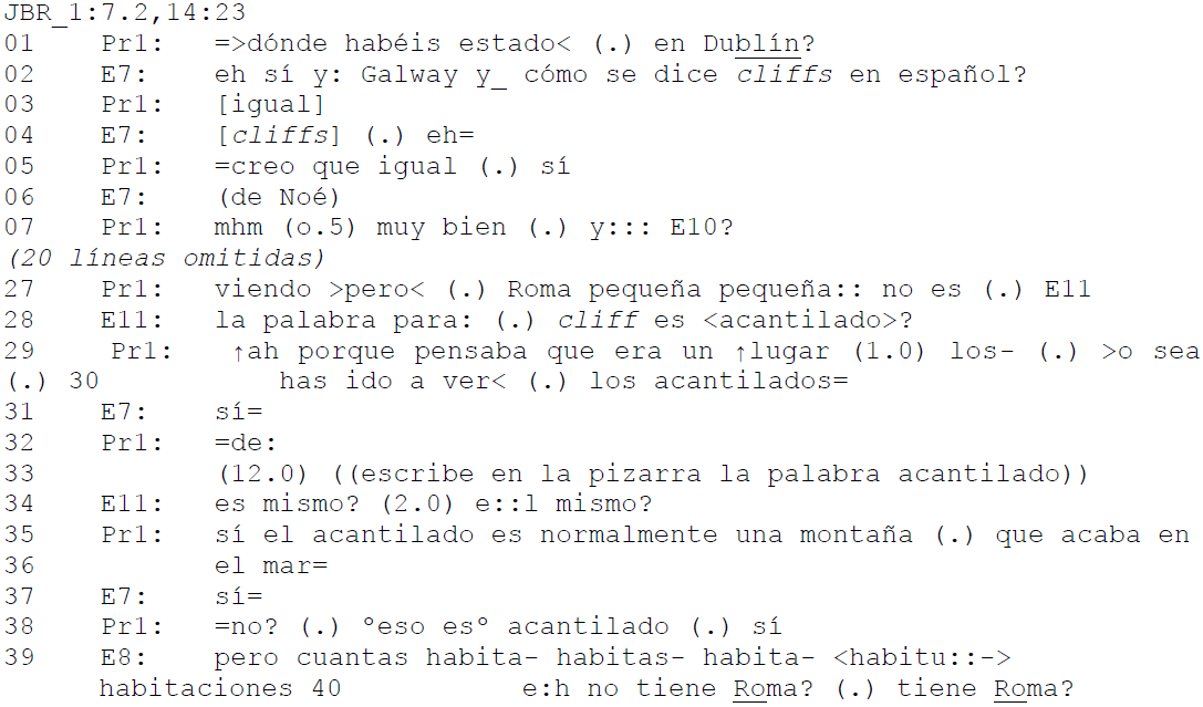 E7, en este caso, no sabe cómo se dice en español (línea 2), por lo que recurre a su lengua materna para expresar lo que quiere decir. No obstante, marca explícitamente su problema al utilizar una iniciación de reparación propia del tipo de secuencias que estamos estudiando. Además, en este caso, incide en el hecho de que quiere expresar esa palabra en español, que es como no sabe decirlo. Acto seguido, el profesor, erróneamente, considera que en español el término es el mismo (línea 3), pensando, muy seguramente, que la alumna se refería a otra ciudad irlandesa, tras haber aludido a otras dos. Sin embargo, es interesante destacar que el profesor muestra cierta inseguridad sobre la reparación aportada (línea 5), pero la interacción sigue su curso. No obstante, mientras el profesor continúa hablando con los alumnos, un estudiante inicia una búsqueda de corroboración de la adecuación del término utilizado por el profesor para llevar a cabo la reparación (datos no mostrados). En un momento dado, levanta la mano para pedir que el profesor le ceda el turno de habla, como así ocurre (línea 28). El profesor reacciona con una muestra de cambio de estado (Heritage, 1984) y con una estructura “yo pensaba”, con la que indica que la reparación anterior era inadecuada y justifica su error, reafirma la adecuación del vocablo que el estudiante acaba de proporcionar. Una vez solucionado adecuadamente el problema anterior, se vuelve a la secuencia de interacción que se estaba llevando a la práctica. Es destacable señalar, a este respecto, que el alumno solicita confirmación una vez que el profesor ha indicado la adecuación del vocablo que ha proporcionado. Vemos que el alumno, asumiendo que va a llevar a cabo una acción que, por contrato didáctico, le corresponde al profesor, busca su corroboración como indicación de que es este último quien mantienen un rol epistémico superior y quien, por lo tanto, debe ser la persona que atestigüe que esa forma es adecuada. La asimetría en la relación entre profesor y alumnos implica que la reparación que proporciona el alumno tenga que ser matizada de manera que se especifique que el profesor mantiene una epistémica de conocimiento superior.
