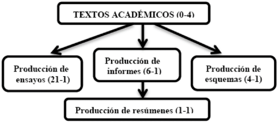 El Gráfico 1 ilustra la dimensión Textos académicos, la cual está relacionada con los códigos: Producción de ensayos, Producción de informes, Producción de esquemas . Producción de resúmenes, géneros textuales que emergieron de los testimonios de los docentes informantes como los más utilizados en sus prácticas de enseñanza de la escritura, bien sea como vehículo para comprobar los conocimientos impartidos en una clase o porque son los textos que trabajan a lo largo del semestre, desde un enfoque de la escritura como proceso (Cassany, 2006b; 1990; Camps, 1990).