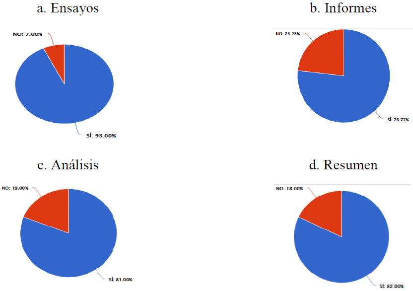 Los profesores que dictan clase en la carrera manifestaron que el texto más solicitado es el examen. Piden algunas veces: informes de investigación, informes de laboratorio, proyectos de investigación, resúmenes, informes técnicos, monografías, tesis e informes de pasantías. Los textos que nunca solicitan son: ensayos, comentarios de textos y análisis (p. 142). Esta investigación refleja la gama de textos que una sola carrera de una institución universitaria puede demandar durante el pregrado como en el área laboral; sin embargo, se revelan datos poco alentadores en comparación con el estudio descrito anteriormente.