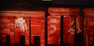 Ajuda-nos a estender esse pensamento a instalação audiovisual In search of vanish blood2, de Nalini Malani3, artista indiana, na qual as imagens de máscara de gás acoplam-se às das mulheres que sobre-vivem e resistem em condições de uma guerra na qual seus corpos, vestimentas, faces e identificações estão engendrados. Neste caso, a mesma máscara transversaliza-se em imagens de ataduras, rostos cobertos, mumificações e o grito como sensação que liberta as cores e as intensidades de luz.