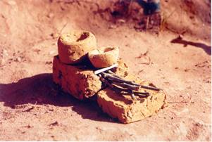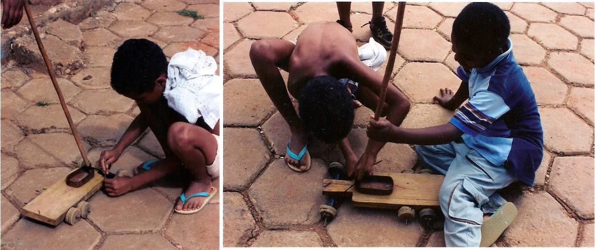 Através das duas fotos acima, observamos o processo de construção de um carrinho tendo como construtores dois meninos de Chapada do Norte, Minas Gerais. Chama a atenção o fato de os meninos conseguirem reunir num único brinquedo elementos aparentemente tão díspares: lata de sardinha, madeira, borracha de chinelos, cabo de vassoura, tampa de cereal. Na tarefa de reproduzir o objeto de desejo, eles se deparam com intrincados e complexos mecanismo como a construção dos eixos das rodas e do sistema de direção (o carrinho é pilotado pelos meninos através de um "volante" de tamanho natural, conectado ao carro através de um cabo de vassoura). Utilizando esta experiência como exemplo, podemos dizer que na experiência em que o brinquedo é construído10, a criança, além de transformar a si própria, também exerce uma demiurgia sobre a matéria, gerando coisas que rolam, que mexem, que andam, que produzem sons, que adormecem, enfim, criva uma vida, não uma propriedade. (AMADO, 2002)
