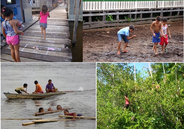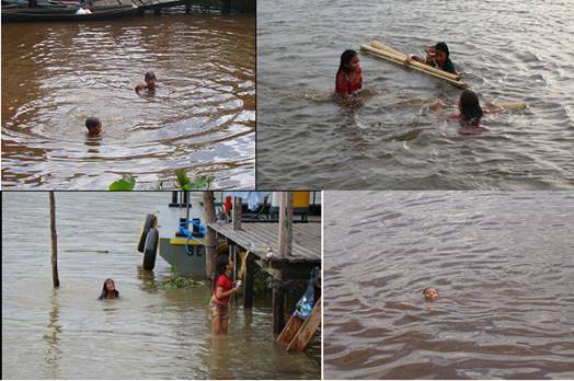Desde a mais tenra idade as crianças, numa prática diária, são levadas, primeiramente, pelos pais ou responsáveis ao rio, e seguras nos troncos são mergulhadas diretamente nas águas barrentas dos rios da Amazônia. Essa prática de banhar-se no rio se torna intensa, e à medida que as crianças crescem começam a ter certa autonomia de vivência nas águas, indo banhar-se sozinhas ou com seus pares, sem a interferência dos adultos, chegando ao número de 4 a 6 banhos por dia. Coelho, Santos e Silva (2015) nos esclarecem que