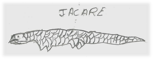 O bicho parece ser grande mesmo, "tem olho bugalhado, boca gradona que come uma gente de uma vez. Corre de uma ponta noutra no rio num mergulho só, de tão porrudo que é" (Keila, 8 anos). "Quanto mais grande tiver a maré, mais o jacaré se mexe no rio" (Pedro Henrique, 8 anos). "Outro dia o jacaré ia agarrando o mudo ali no outro lado. Ele tava mijando do outro lado da escada, da primeira escada, o jacaré tava só olhando pra ele. Na hora que ele mergulhou, ele viu borbulho, ele pensava que não um jacaré tava só mirando ele" (Keila, 8 anos). Nas narrativas percebe-se que há uma ênfase nas falas para garantir a veracidade dos fatos "[...] nosso devaneio é incansável, interfere na realidade, poetizando a relação pregnante com essa realidade, o que faz com que, tantas vezes, o imaginário seja mais real do que o real [...]" (LOREIRO, 2007, p. 17).