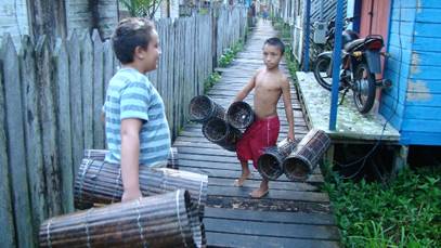 Matapi serve pra pegá camarão. Pra fazê o matapi é assim, a gente aprendeu com o pessoal aí. Corta o arumã, tira toda a folha e deixa secá no sol aquela casca dele, depois quando tiver seco corta os pedaços, as talas, pega o cipó e amarra pedaço por pedaço, vai formando um negócio parece uma casinha, depois faz as portinhas para colocá a isca. Pra pegá o camarão, nós coloca o matapi dentro d'água e amarra com o fio num toco pra maré não levá. Pra vim o camarão nós coloca cuí de farinha dentro ou se tivé ração coloca dentro de um saco, fura e deixa o camarão senti o cheiro, aí ele vem comê, quando ele entrá no matapi, ele não sabe mais saí, fica preso, de manhã é só puxá o matapi e tirá o camarão que ficou preso (PAULO DOS VALES, 8 ANOS).