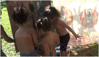 É importante salientar que o cotidiano das atividades propostas pela professora é bem flexível, não organizado em rotinas como frequentemente encontramos na Educação Infantil, com isso, as filmagens foram se tornando parte do cotidiano, e a pesquisadora interagindo com as crianças, na medida que, pediam: para olharem na câmara, para a pesquisadora auxiliarem a transportarem material, outras que pediam ajuda para subir nas árvores, algumas mostravam os suas as atividades que estavam fazendo, o seu corpo pintado de tinta, as próprias crianças incorporavam a pesquisadora nas propostas feita pela professora. O tempo de encontro da professora com as crianças é dinâmico; o próprio ato de fazer, de mediar, de acontecer aos poucos vai materializando as atividades, no próprio fluxo das relações das crianças com a professora e entre as próprias crianças; é com o tempo e no próprio tempo que a participação das crianças vai surgindo, e, aos poucos, as práticas pedagógicas vão tomando forma, de tal modo que conteúdos - um desenho, uma pintura, um recorte, uma colagem, uma música, uma dança vão surgindo. Feitas as observações, foram selecionadas das filmagens algumas situações, fragmentos de um dia, que convergiam aos objetivos do estudo para suas respectivas análises. Estes fragmentos foram transcritos e são apresentados a seguir, na forma de cenários, para que seja possível uma visualização mais ampla do contexto.