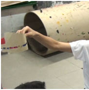 Em uma das conversas com a professora, ela nos explica que estavam fazendo uma atividade em que recortavam gravuras de revista e que Marcos apresentou uma gravura de um farol. Como já tinham em sala um rolo de papelão grosso, largo e comprido, maior que as crianças, a professora compartilha com elas a ideia de construir um farol, utilizando este rolo. Durante o período de observação a professora ofereceu três vezes oportunidades de produzirem o farol, sem seguir uma rotina rígida. A professora colocava-o deitado no chão da sala, encostado em uma das paredes, sempre anunciando que o farol estaria disponível para quem quisesse preenchê-lo; juntamente a ele, disponibilizava diversos tipos de grãos, miçangas e lantejoulas. O registro seguinte apresenta trechos das vezes em que o farol foi construído: As crianças se aproximam do farol, cada qual procura um tubo de cola, escolhem o objeto que desejam colar e o colam; em momentos em que a quantidade de cola é excessiva, a professora aproxima-se da criança e a orienta sobre o uso do tubo e sugere que pode aproveitar o local em que ficou a cola escorrida para colocar outras pecinhas. Algumas crianças pegam pedaços de barbante que estão sobre a mesa, utilizado pela professora em outra atividade (no auxílio de confecção de máscaras), e colam sobre o tubo. Em um dos dias em que o farol foi disponibilizado, uma criança passou um grande período tentando colar feijões; eles escorregavam, mas com muita paciência e persistência, conseguiu colar diversos feijões. Ao mesmo tempo, alguns colegas, sozinhos ou acompanhados, entravam no tubo com brinquedos e, consequentemente, o tubo se mexia (rolava um pouco); nestas ocasiões, a professora falava para as crianças que estavam dentro do tubo para tomarem cuidado; em certo momento, apoiou uma cadeira em cada ponta do tubo para que ele não rolasse, e as crianças continuaram a brincar, mesmo com amigos colocando objetos.