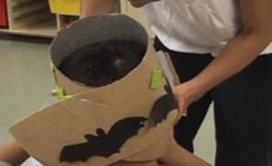Neste dia, a professora traz uma folha grande desenhada, senta com as crianças no chão, e comenta: Profa: Vocês lembram da estória que vocês desenharam? Abre a folha e algumas crianças começam a recontar a estória desenhada por eles, juntamente com a professora. Logo em seguida, a professora propõe que façam roupas e máscaras dos personagens da estória; salienta que podem escolher qual elas queiram. Aqueles que se interessaram pela proposta partem para a confecção de suas roupas, coroas, espadas e máscaras. Gradualmente, outras crianças começam a se envolver na atividade. A professora vai auxiliando, dando dicas sobre como fazer a máscara: ora orienta as crianças a desenharem, primeiramente no papel crepom, duas linhas na largura da máscara, ora mostra o modelo dos amigos, ora indica como traçar; depois dá instruções para que elas recortem na linha; cada uma vai traçando e recortando do seu modo, algumas com mais facilidade, outras com menos. Depois retornam à professora para fazer o contorno para abertura dos olhos; mais tarde, novamente a procuram para fixar as máscaras em seus rostos. Quanto às espadas, as crianças pegaram um rolo de papel crepom metalizado, passaram várias vezes uma fita adesiva transparente, para obter uma parte mais firme onde apoiariam as mãos. Depois colocaram as máscaras, pegaram as espadas e foram brincar de luta. Alguns voltavam e auxiliavam colegas na confecção da espada; outros que tiveram dificuldade de enrolar a fita, pediram ajuda para a professora. Laís fez uma saia e depois uma blusa de papel crepom e a professora a auxilia, fixando o barbante para amarrar as peças no seu corpo, enquanto algumas meninas picam pedaços de papel e colam em um barbante para fazerem colares e pulseiras. Laís observa que um menino está com uma coroa, pede para professora fazer-lhe uma; a professora a orienta, ao invés de fazer por ela. Após terminar, Laís passa a manhã vestida com a roupa e a coroa; ao saírem para o almoço, pede para professora se poderia ir com as peças; a professora consente. Cada criança cria a sua máscara, sua coroa compondo formatos diferenciados de acordo com os recortes que fazem e personalizam-nas conforme o material que usam: algumas colam lantejoulas, outras utilizam papel crepom metalizado; outra recorta tão pequeno que não serve em seu rosto; quando isso ocorre, a professora convida a criança para fazer outra. A confecção das máscaras retorna num outro dia, pois a professora pega as que algumas crianças não haviam terminado e as chama para fixar o elástico. Como de costume, deixa os materiais que as crianças fizeram expostos na sala o que permite, por exemplo, que Lúcio pegue sua máscara para acrescentar mais papéis e que algumas crianças comecem a confeccionar outras também. O resultado final das produções é extremamente diversificado.