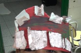 Destacamos aqui o modo pelo qual a professora lida com o tempo: num primeiro momento é o tempo de apresentar, de oferecer os materiais às crianças, seguido por um tempo em que lhes permite conhecê-los, familiarizarem-se com ele; a professora respeita o tempo do desejo de cada um, no sentido de realizar ou não a atividade; por fim, o tempo de duração para executá-la é decidido por cada criança. Esta atividade ocorreu em vários dias, dias aleatórios, e ainda não havia sido encerrada quando deixamos o campo, pois é um trabalho longo e não existe urgência para completá-lo; caso houvesse, as crianças não dariam conta em fazê-lo; por isso, disponibilizar, concomitantemente, outras atividades em diversos dias, é um procedimento bastante interessante para que o prazer na produção não se transforme em aceleração do ritmo para cumprir um cronograma rígido.