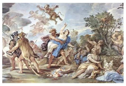 Nessa imagem podemos ver as Sereias como criaturas com feições humanas, asas, rabos e pés de animais. Elas sobrevoam a cena do rapto que está acontecendo, numa bela obra de Luca Giordano.