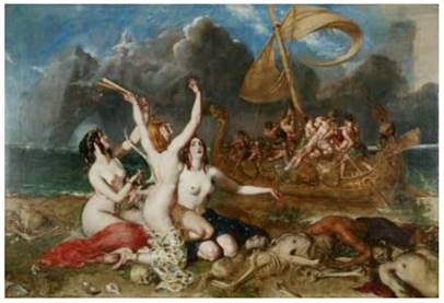 Paralelamente a esse exercício, buscamos obras que falavam sobre as Sereias, sua genealogia, características físicas etc., e verificamos que os textos mais antigos, pelo menos os dois que conseguimos ter acesso, se referiam a dois poemas épicos: a Odisseia, de Homero - mais especificamente o livro XII, e a Metamorfose, de Ovídio - mais especificamente o livro V. Depois de analisadas essas obras, buscamos algumas imagens que pudessem esboçar tanto os acontecimentos quanto as personagens desses poemas. O intuito foi aproximar texto e imagem, buscando verificar como os artistas se apropriaram dos elementos textuais dos mitos das Sereias para construírem suas ilustrações, obras de arte e demais produtos culturais.