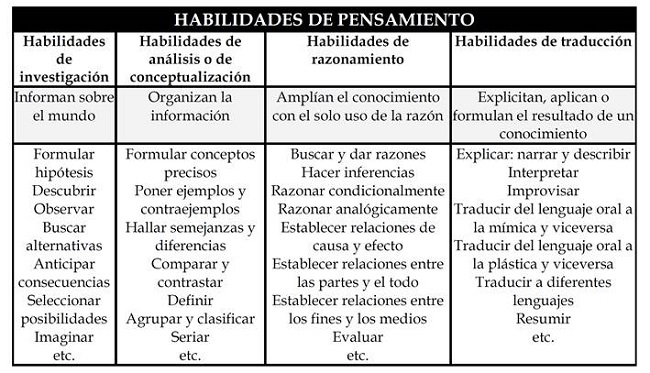 Fuente: CARRERAS, Carla. “Filosofía para Niños: el desarrollo global de la habilidades de pensamiento” en BARRIENTIS RASTROJO, 2013, p. 99.