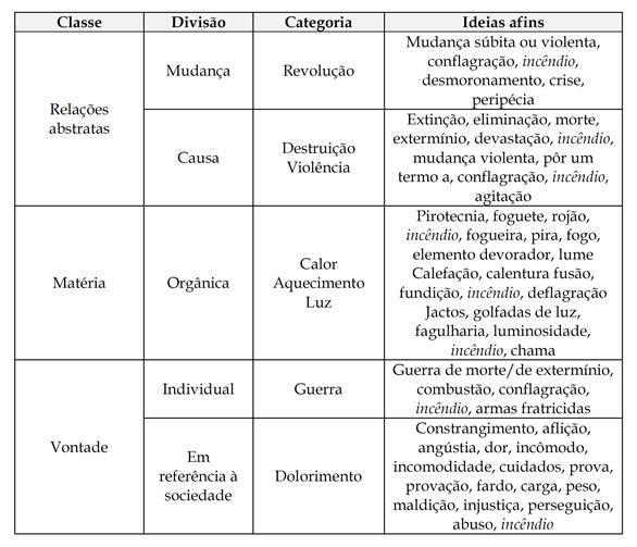 Comecemos pelo título da peça de Wadji Mouawad. O Dicionário analógico da língua portuguesa (AZEVEDO, 2010) lista a palavra incêndio no interior de três categorias: relações abstratas, matéria e vontade, conforme o quadro I.