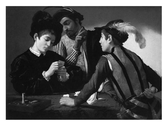 Consagrado pelos estudiosos da obra de Caravaggio ora como um retrato realista dos costumes da época, ora como uma parábola moral contra o vício e a corrupção, Il bari presta-se aqui, no entanto, a outro tipo de perspectivação, mais afeita à alavancagem de certos efeitos de pensamento acerca do próprio ato de jogar cartas, do que à remissão aos supostos significados etéreos que aquela composição pictórica traria embutidos em si.