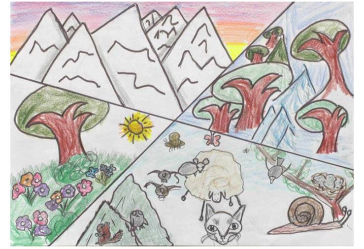 The mountains in the upper part of the painting show the inorganic part of nature. While the side parts with the plants and lower part with the animals represent the growing and organic nature. In summary, the German children arrived at a definition of nature that very much resembled the one of Aristotle, who sees nature as what is by and in of itself (HÖFFE, 2008).