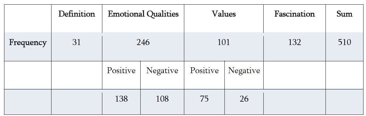 The category 'emotional qualities' comprises all statements that entail an emotional attitude towards nature. Nature is seen as a safe haven where one can relax and recover from everyday life. Here, emotions like gratitude and admiration are being expressed. Whereas in confrontation with nature's destructive forces, emotions like fear or mental disturbance may arise as well.