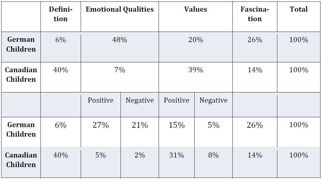 The deductively-inductively results of the philosophical system enveloped the following categories: a. Definitions, b. Emotional Qualities, c. Values and Significance and d. Fascinations. The deductive derivation led to the philosophically based input and questions yielded from the CoI, while the children's statements inductively defined the content of the categories. If the children's statements had opened up another category, we would have expanded our own system of deductively-gained categories. However, this was not the case. Two independent research fellows (evaluators) assigned all children's statements to the various categories. In order to comprehend the categories, we trained the evaluators (research fellows) as well as gave them some exemplary sentences. The interpretation follows a hermeneutic method. The examples of the German children in this article were translated to English. In the following sections, we are exemplifying each category by statements from both the German and Canadian children. They will be further differentiated and exemplified through central test sequences from the CoI.