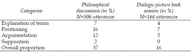In total, 37% of the children’s utterances in philosophical discussion could be categorised as explanation of terms, adopting a position, argumentation or supposition; whereas in the dialogical picture book reading this figure was only 16% (Table 1). The speech acts of the children differed depending on the situation, so that the hypothesis “The children in the philosophical discussions explain terms to a greater degree, adopt a position more often, use more argumentation and voice suppositions more often,” can be confirmed.